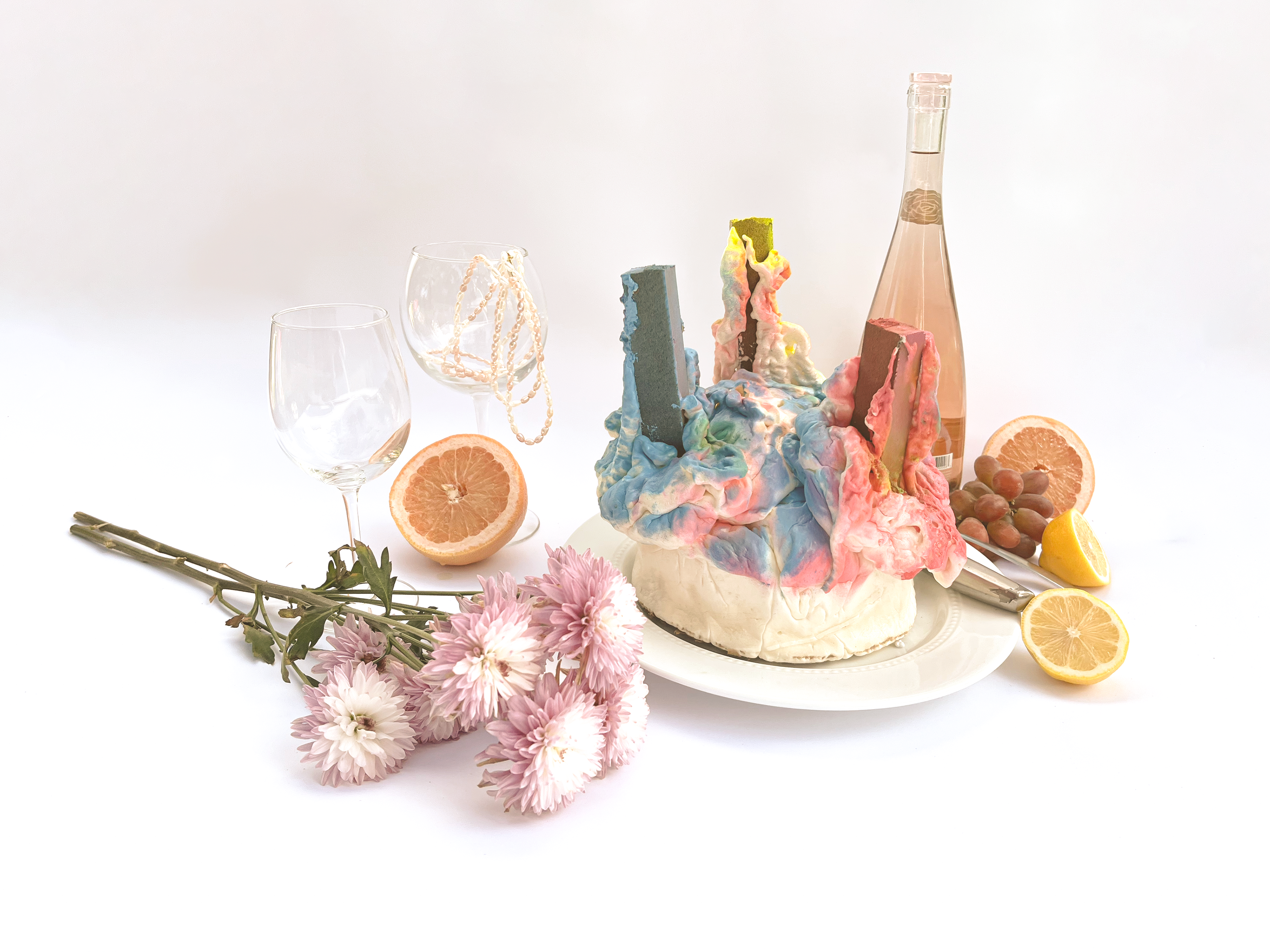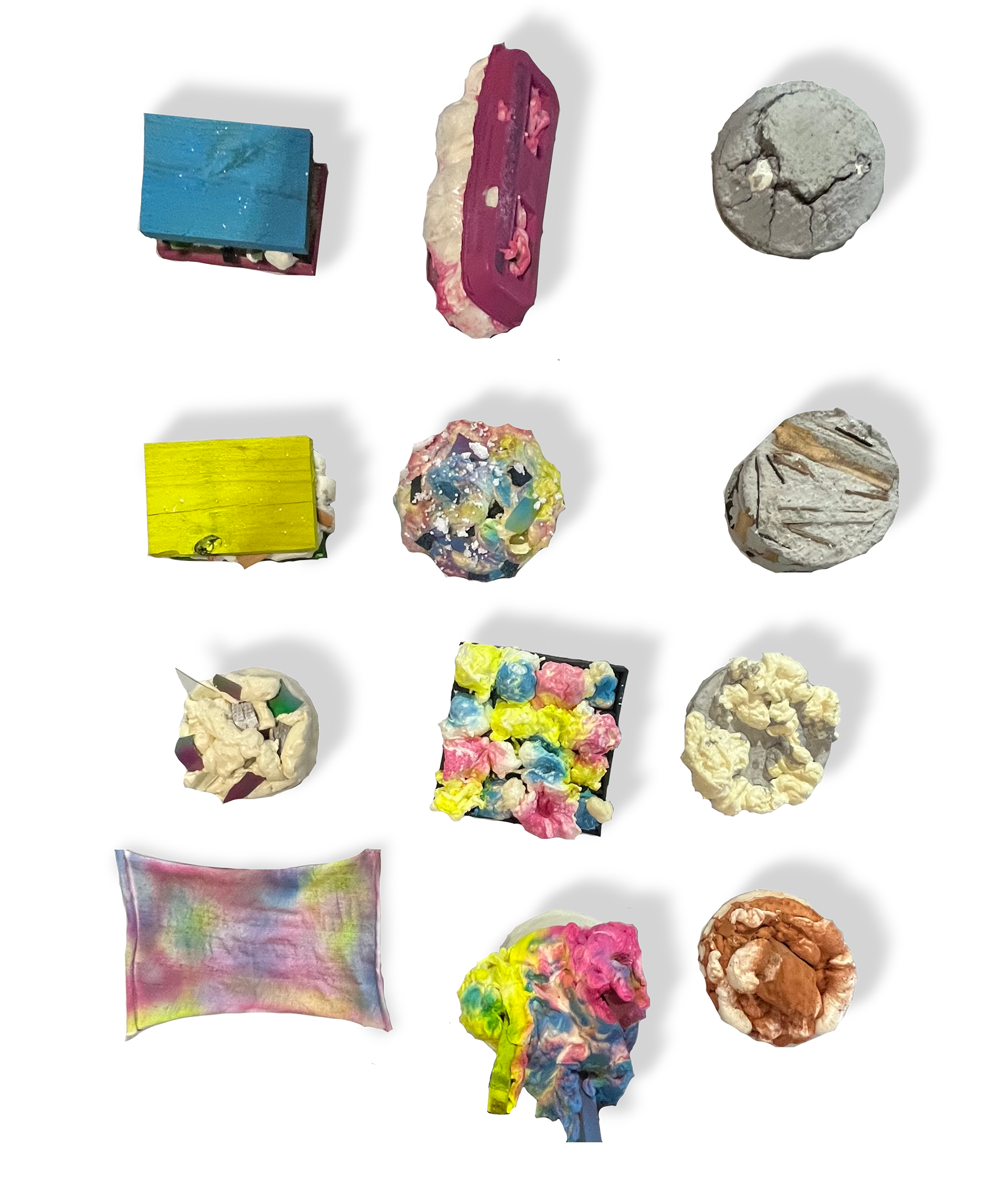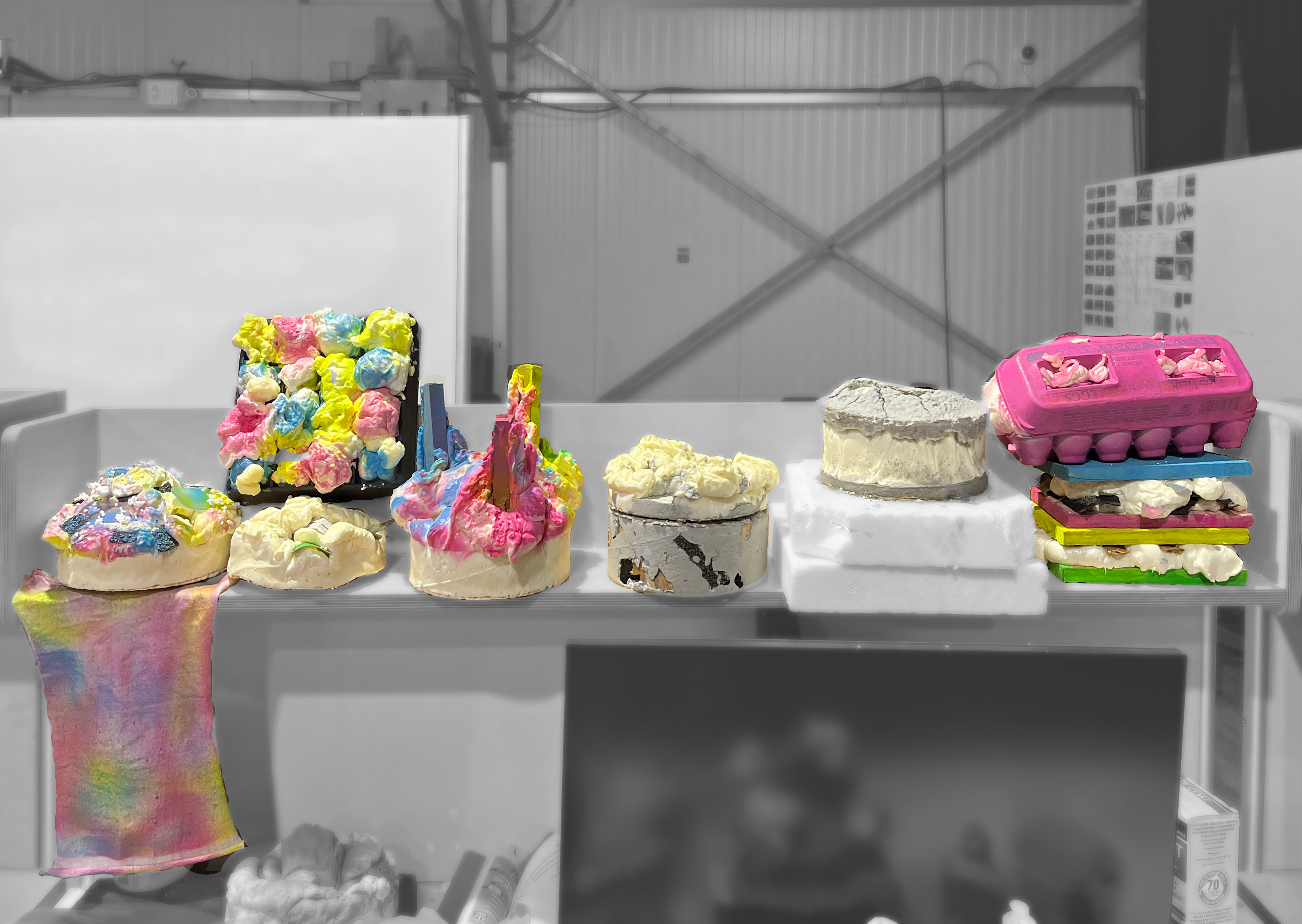 "Different Cakes" rethinks our own perception of construction waste through the use of common building materials. The always hidden and ubiquitous insulator spray foam was used to cast various objects in molds infused with paints, scraps, and textures. Then, to further decontextualize the material from its origin, the objects were photographed in a posh still-life setting similar to a Dutch Renaissance painting.