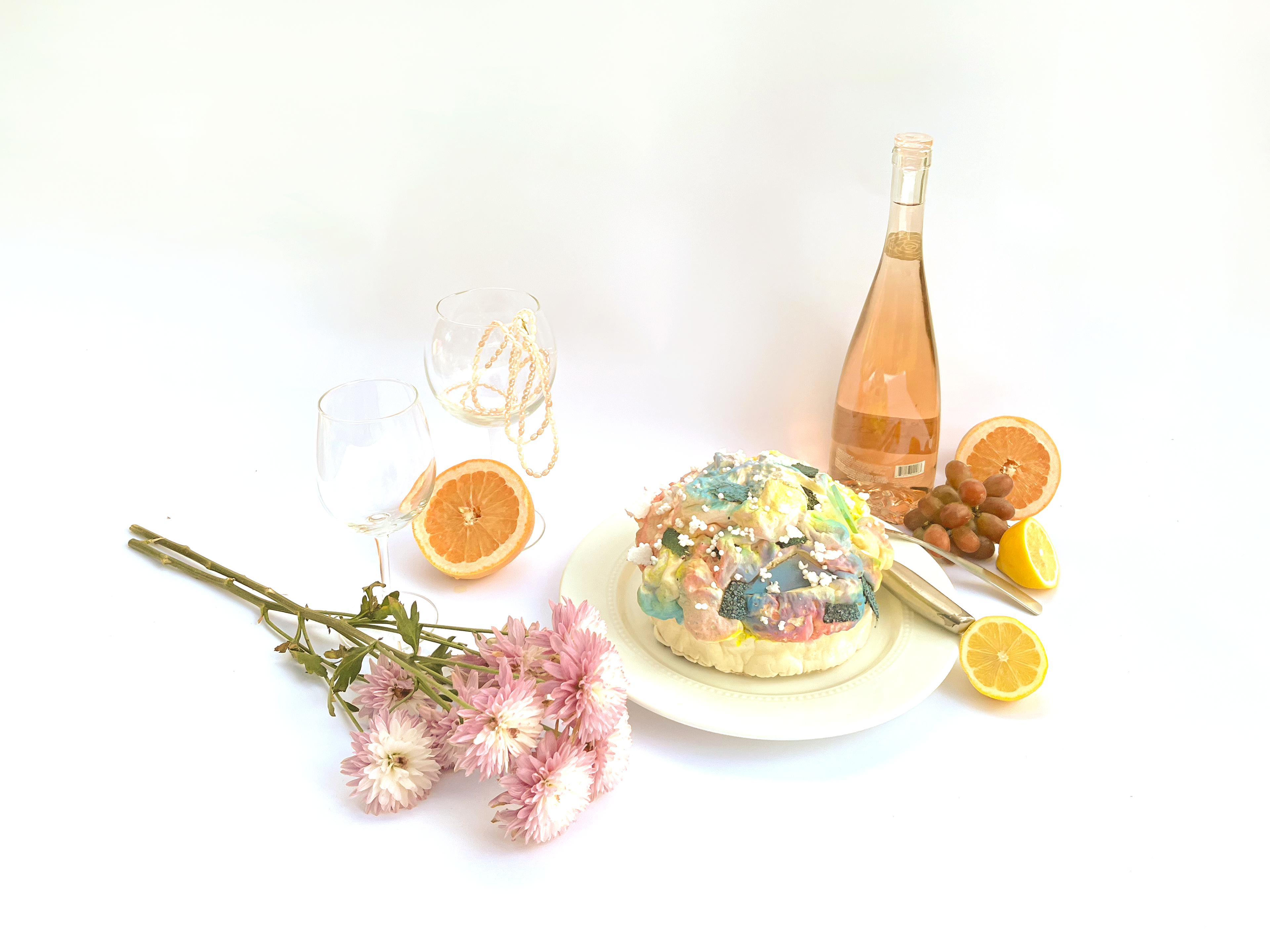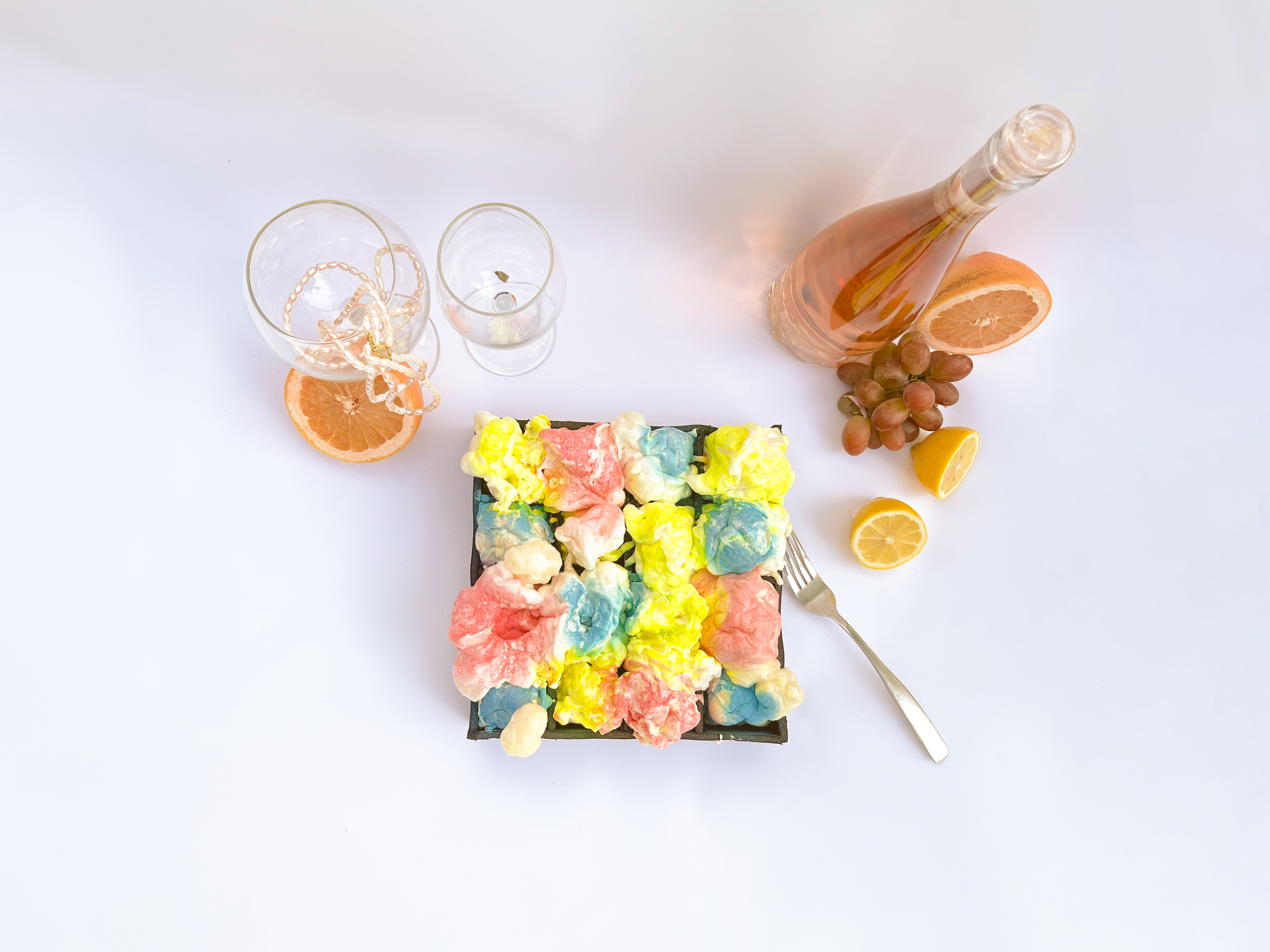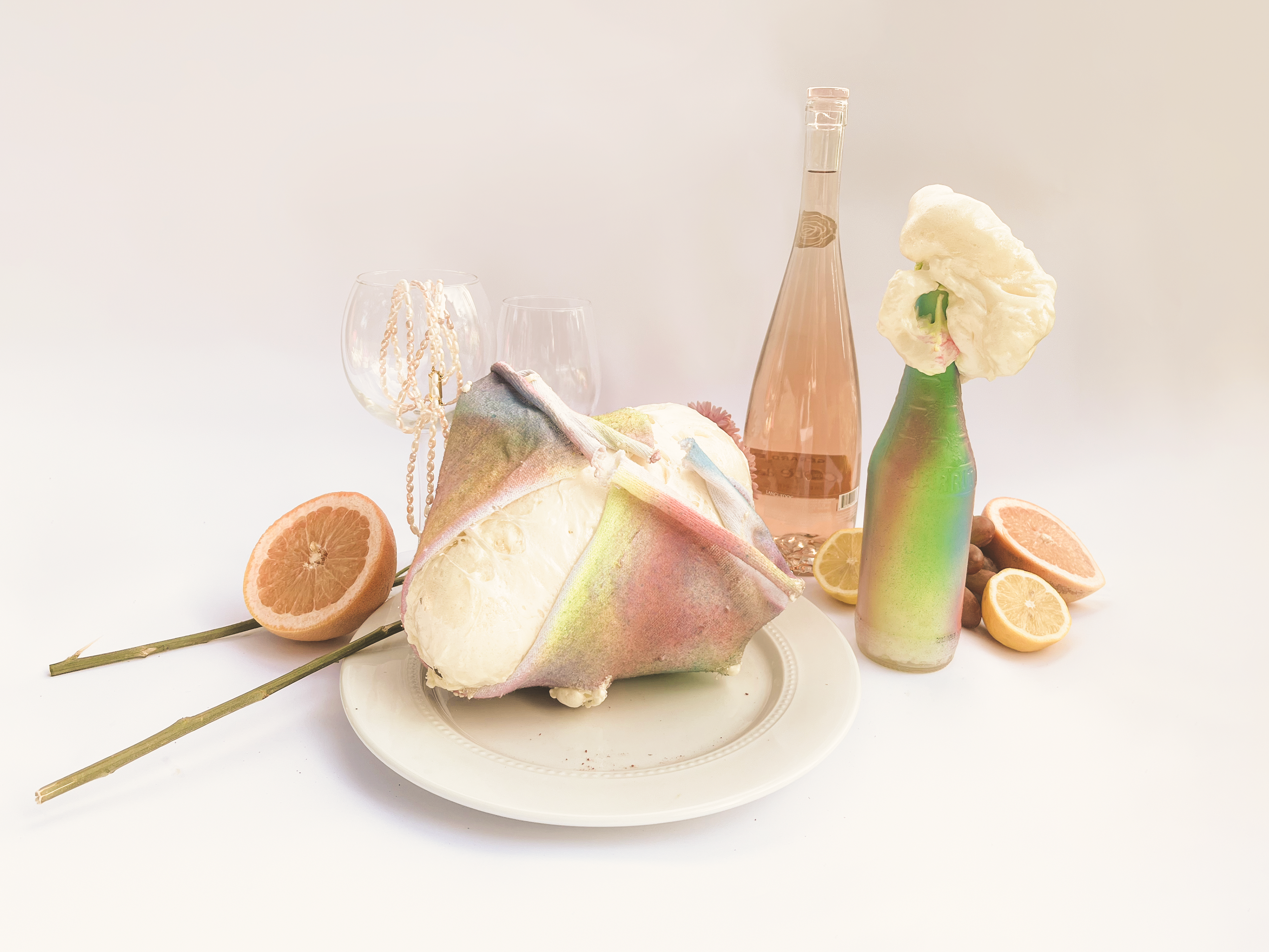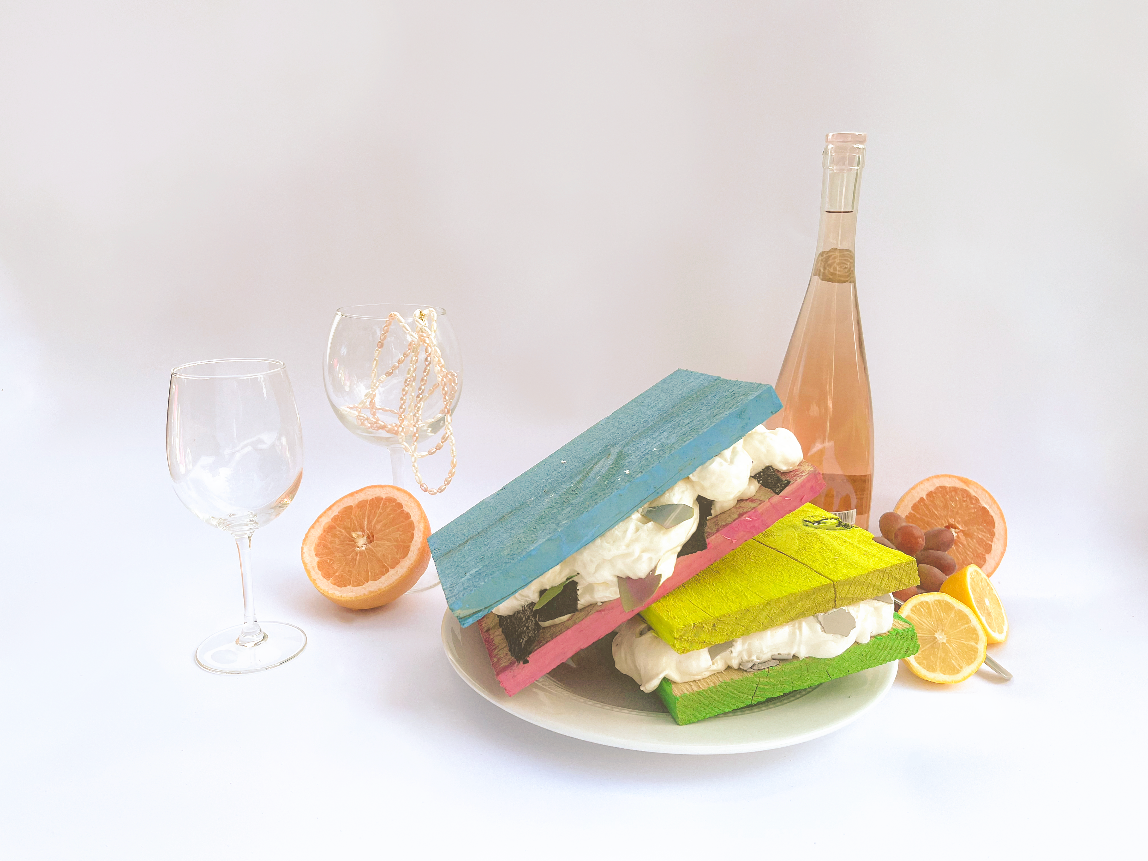 "Different Cakes" rethinks our own perception of construction waste through the use of common building materials. The always hidden and ubiquitous insulator spray foam was used to cast various objects in molds infused with paints, scraps, and textures. Then, to further decontextualize the material from its origin, the objects were photographed in a posh still-life setting similar to a Dutch Renaissance painting.